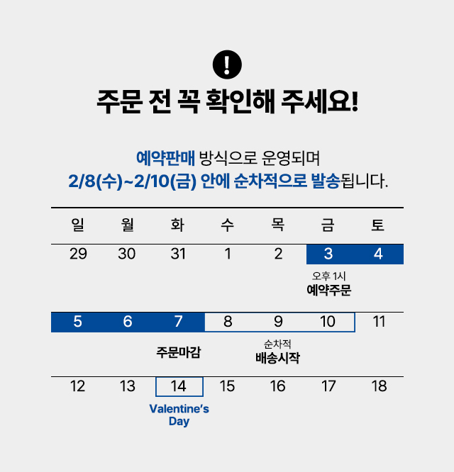 발렌타인데이 3종 선물세트 주문은 2/8(수)~2/10(금) 동안 주문 순서대로 순차발송 됩니다.